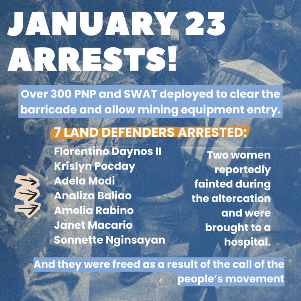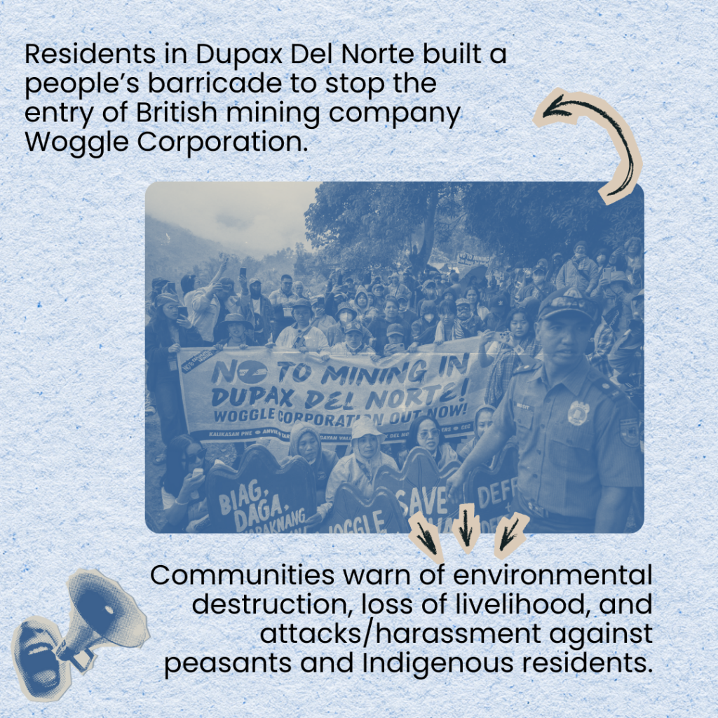 Dupax Del Norte, Nueva Vizcaya is standing its ground. Residents and advocates continue a people’s anti-mining barricade against the entry of UK-based Woggle Corporation’s gold and copper exploration project. Reports say the barricade was forcibly demolished on January 23 after a massive police deployment, leading to the arrest of seven land defenders, who have now been released through the strength of the people’s movement and collective action.