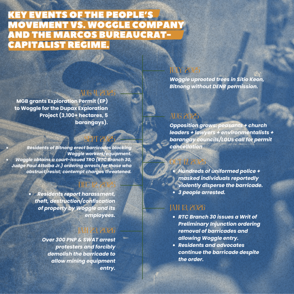 We condemn the Marcos Jr. government – a top bureaucrat capitalist regime – and mercenary military and police forces being used to clear the way for foreign corporations to enter communities’ lands. Cancel Woggle’s permits. Stop the operation. Defend land, livelihood, and people’s rights.